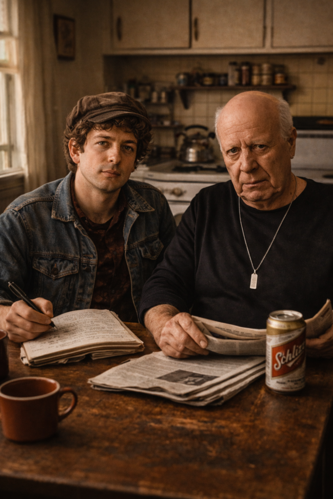 The kitchen is quiet except for the rustle of a newspaper and the soft click of a coffee cup being set down. Rob Zillon sits at the table, his guitar leaning against the wall within easy reach. E.J. Gold is sitting nearby, not so much participating as occupying the room the way a tuning fork occupies air. Nothing feels staged.
