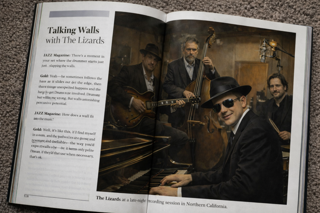 The Lizards are a late-night piano lounge quartet devoted to exploring the edges of jazz, good manners, and structural integrity. Formed during a particularly strange recording session that refused to end, the group quickly developed a reputation for elegant chaos and beautifully controlled musical accidents.