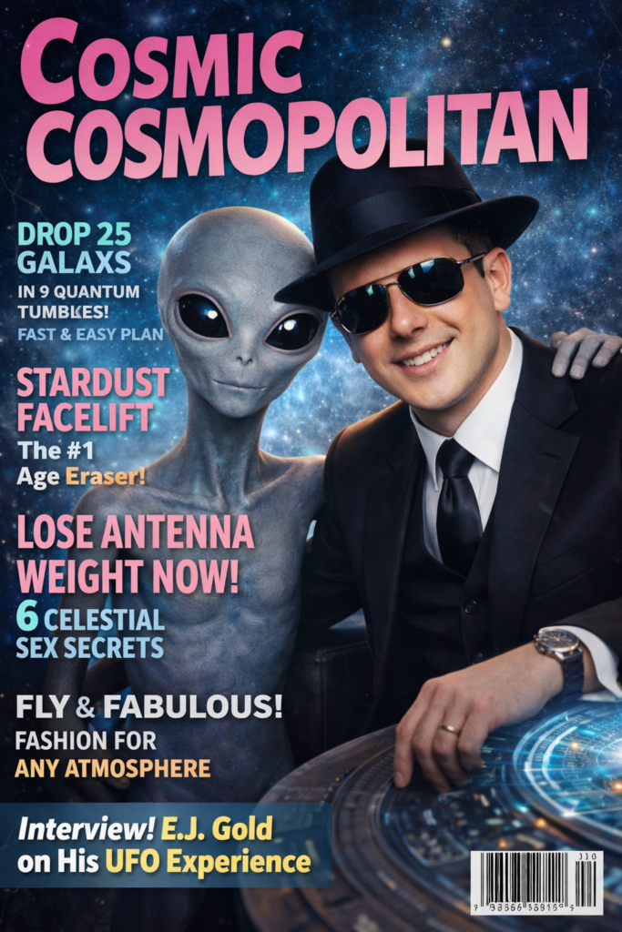Before I could decide whether I should wave politely or hide behind a tree, a beam of light came down and — whoosh — the next thing I knew I was standing inside what appeared to be a very clean, very modern spacecraft.